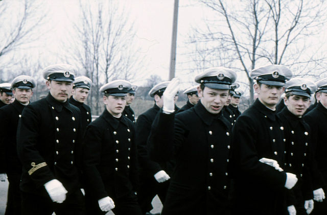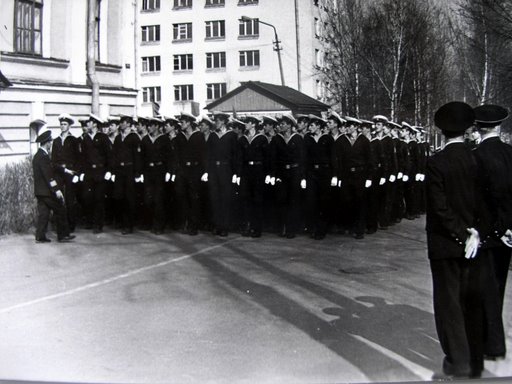 Принятие присяги. Строевой смотр проводит Петрухин ...(фото Георгия Степанова) К первомайскому параду стаптывали каблуки. Гнедину трудно угодить...Но какая довольная физиономия потом была у него на трибуне... (фото Георгия Степанова) Сытые,счастливые с камбуза опять в аудитории...(фото Георгия Степанова)