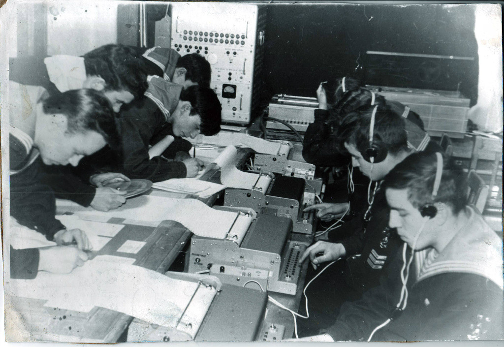 Орябинский Е., Кузьмин, Кузнецов, Лаврентьев, Алексеев 1976 г.Кабинет синоптики. Аэрологи. Фото Егорова |