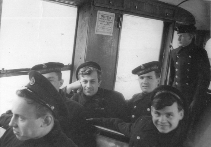 В трамвае с Охты в Стрельну. Слева: Валентин Джериппа, рядом с ним Михаил Гуржи - вратарь футбольной команды. Лучезарно улыбается Николай Грачев. Слева в профиль Юрий Дмитриев. (фото из личного архива В. Хилковского)