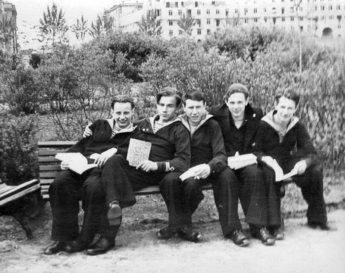 Слева направо - Денисов Анатолий, Кожарский Герман, Троценко Владимир, Макарцев Рудик. Стрельна 1955 г (фото из архива В. Троценко)